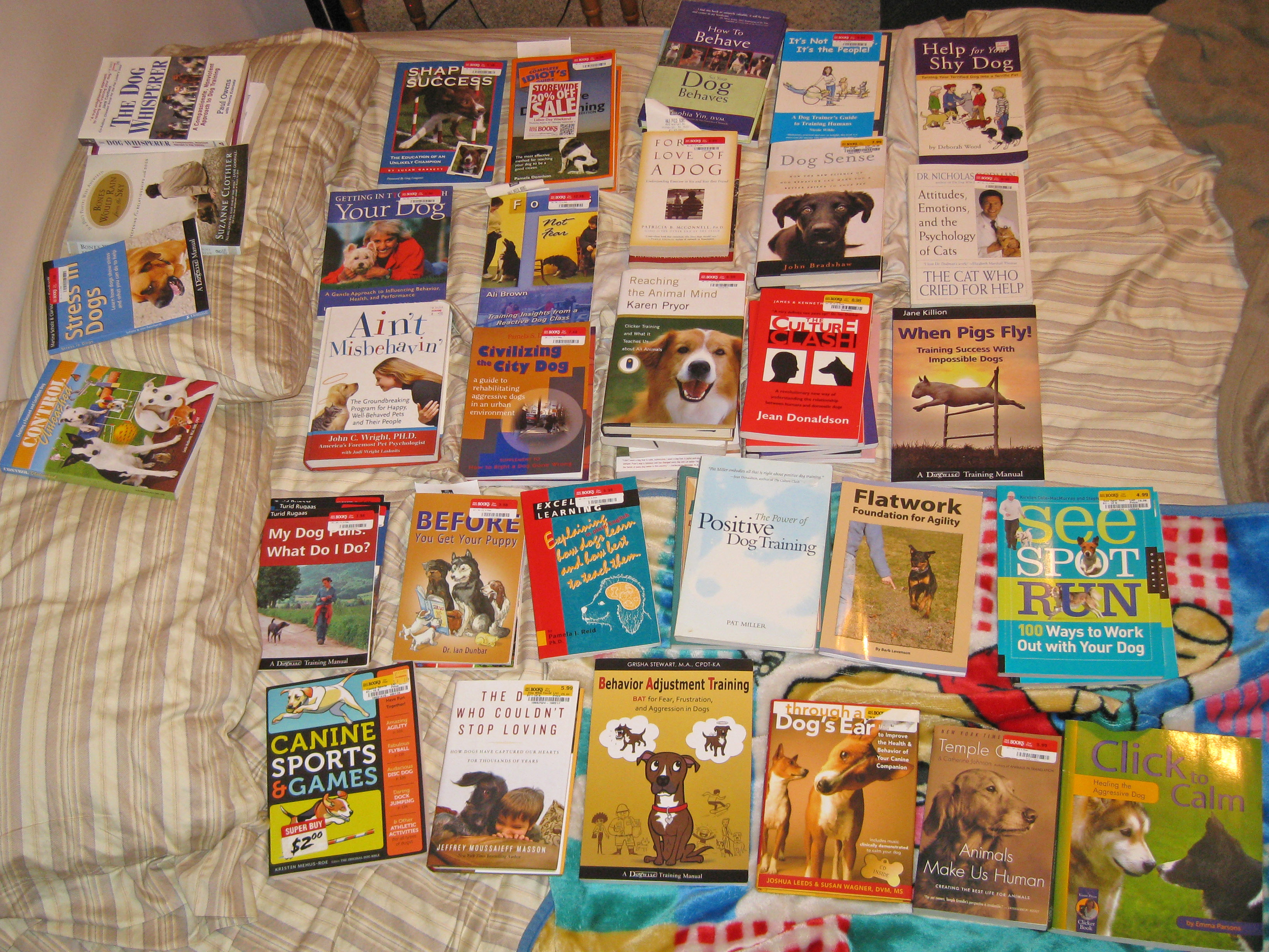 So, I took a few hours to collect most of my canine/training books and to create an inventory list of all the books I currently have (or all of the ones I easily found, I know I’m missing a few others that are probably in bags I took on trips). I laid out all of the books in piles by author and was a little bit shocked by just how many books I have…